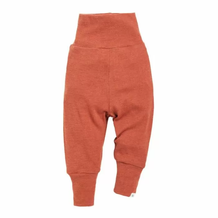 Denne lette babybuksen i ull med silke har ekstra bred og elastisk linning uten strikk i livet slik at den ikke strammer rundt babyens mage. Vi har laget buksen romslig og god i fasongen slik at barnet får full bevegelsesfrihet, og med lange vrangborder på beina som holder den oppe. Den kan brukes både med og uten oppbrett på vrangbordene, noe som gjør den fin å vokse i. Klær med lang brukstid er praktisk for barn som vokser. Ønsker du en smalere modell kan du se her på Ulltights i størrelse 56-98. og her for Ullbukse med knapper.