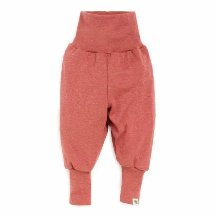 Denne lette babybuksen i ull med silke har ekstra bred og elastisk linning uten strikk i livet slik at den ikke strammer rundt babyens mage. Vi har laget buksen romslig og god i fasongen slik at barnet får full bevegelsesfrihet, og med lange vrangborder på beina som holder den oppe. Den kan brukes både med og uten oppbrett på vrangbordene, noe som gjør den fin å vokse i. Klær med lang brukstid er praktisk for barn som vokser. Ønsker du en smalere modell kan du se her på Ulltights i størrelse 56-98. og her for Ullbukse med knapper.
