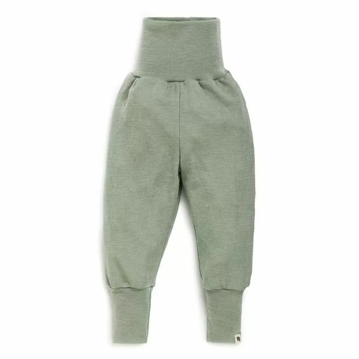 Denne lette babybuksen i ull med silke har ekstra bred og elastisk linning uten strikk i livet slik at den ikke strammer rundt babyens mage. Vi har laget buksen romslig og god i fasongen slik at barnet får full bevegelsesfrihet, og med lange vrangborder på beina som holder den oppe. Den kan brukes både med og uten oppbrett på vrangbordene, noe som gjør den fin å vokse i. Klær med lang brukstid er praktisk for barn som vokser. Ønsker du en smalere modell kan du se her på Ulltights i størrelse 56-98. og her for Ullbukse med knapper.