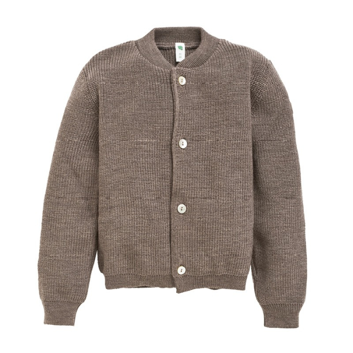 Babyjakke i patentstrikk med perlemorsknapper. Denne jakken er strikket i myk og varmende merinoull som er ubehandlet. Jakken har ribbeavslutning på bol og ermer, og krage i halsen.