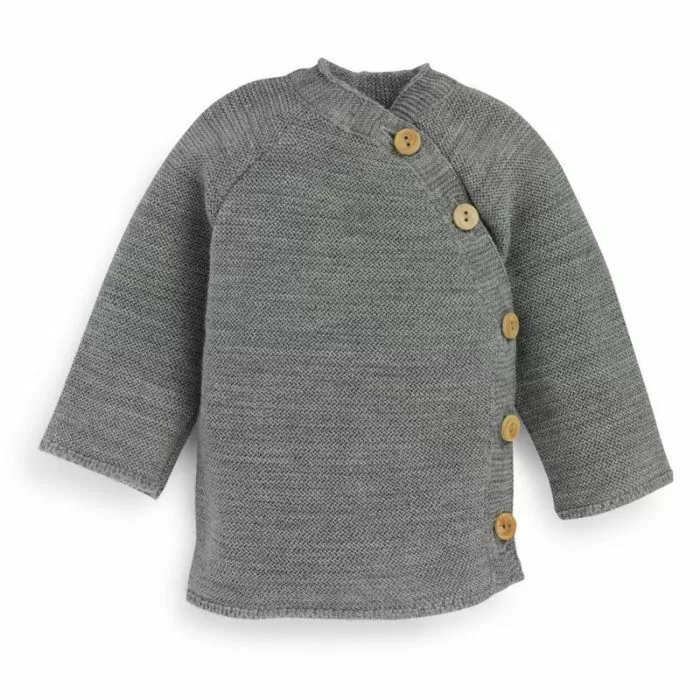 Søt jakke i rillestrikk med treknapper. Jakken har raglanermer og god elastisitet, og er lett å kle av og på babyen. Omslagsmodell, men med enkelt stofflag foran slik at det ikke blir for tykt. Sammen med den tilhørende babybuksen får du et fint hentesett, og settet kan fint brukes året rundt. Brukes inne på vinteren og ute på sommeren.