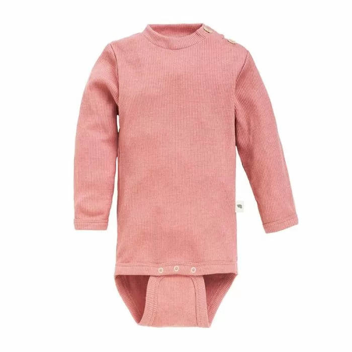 70% økologisk, ubehandlet merinoull, 30% silke. Bodyen er strikket i en ribbet kvalitet.