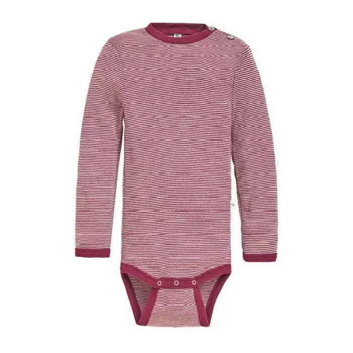 En myk og elastisk body i 70% økologisk, ubehandlet merinoull, 30% silke. Knappingen på skulderen gjør at den lett vippes over hodet på den lille, samtidig som den slutter tett og godt rundt hals og skuldre, slik at barnet ikke blir kald der. Barnet trenger bare to-tre bodyer når dere går for ubehandlet ull (se utstyrslisten under Ullguiden vår). Ullbodyer starter på størrelse 56/62. Barnet vokser ca en cm i uken de første 12 ukene, så en litt for stor body med oppbrett i starten gjør at den varer lenger enn et par uker. Vi har bodyer i størrelse 50 og mindre også, de finner du under "Prematurklær".