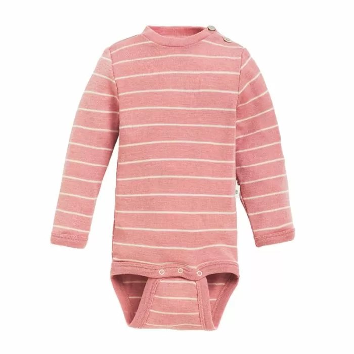 En myk og elastisk body i 70% økologisk, ubehandlet merinoull, 30% silke. Knappingen på skulderen gjør at den lett vippes over hodet på den lille, samtidig som den slutter tett og godt rundt hals og skuldre, slik at barnet ikke blir kald der. Barnet trenger bare to-tre bodyer når dere går for ubehandlet ull (se utstyrslisten under Ullguiden vår). Ullbodyer starter på størrelse 56/62. Barnet vokser ca en cm i uken de første 12 ukene, så en litt for stor body med oppbrett i starten gjør at den varer lenger enn et par uker. Vi har bodyer i størrelse 50 og mindre også, de finner du under "Prematurklær".