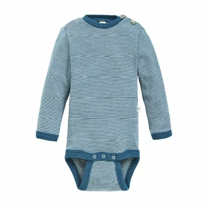 Myk ullbody i økologisk ull blandet med silke. Lange ermer og god halsåpning med perlemorsknapper på den ene skulderen, slik at den lett går over hodet samtidig som den sitter inntil. Ull er temperaturregulerende og behagelig året rundt.