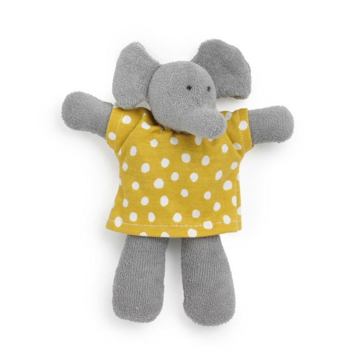 Myk Elefant i naturmaterialer. Økologisk bomullsfrottè på utsiden og fyll av økologisk ull. Ca 23 cm.
