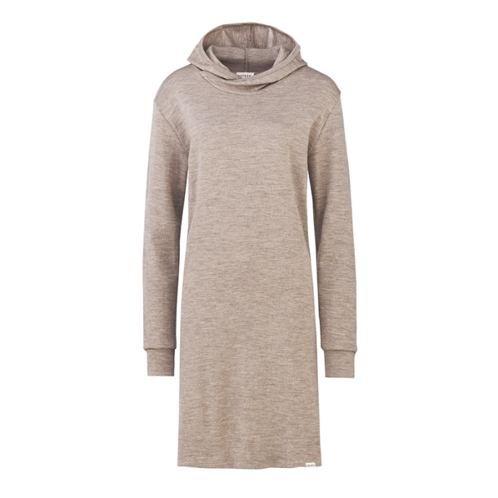 Kul ullkjole i ledig fasong og med hette. Like fin på jobben som på hyttetur. 100% økologisk, ubehandlet merinoull.