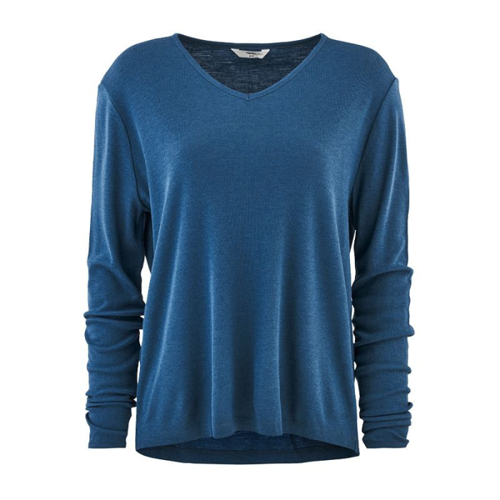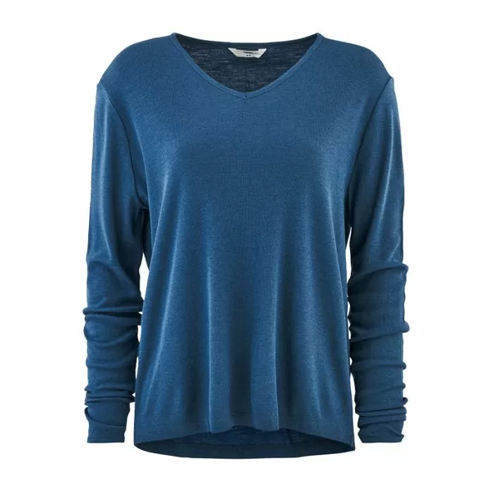 Løstsittende genser i ull med silke, V–hals - Dongeriblå
