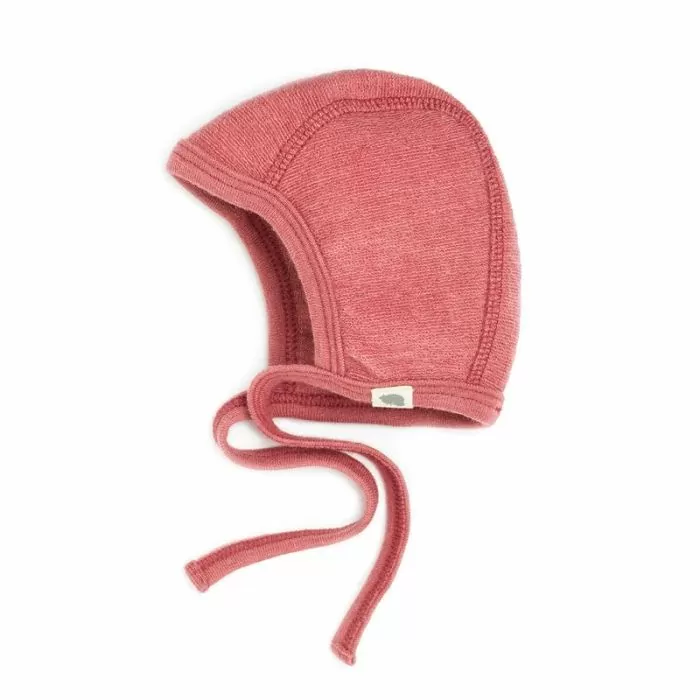 - Myk babylue i hjelm-modell med flate sømmer og knyting under halsen.