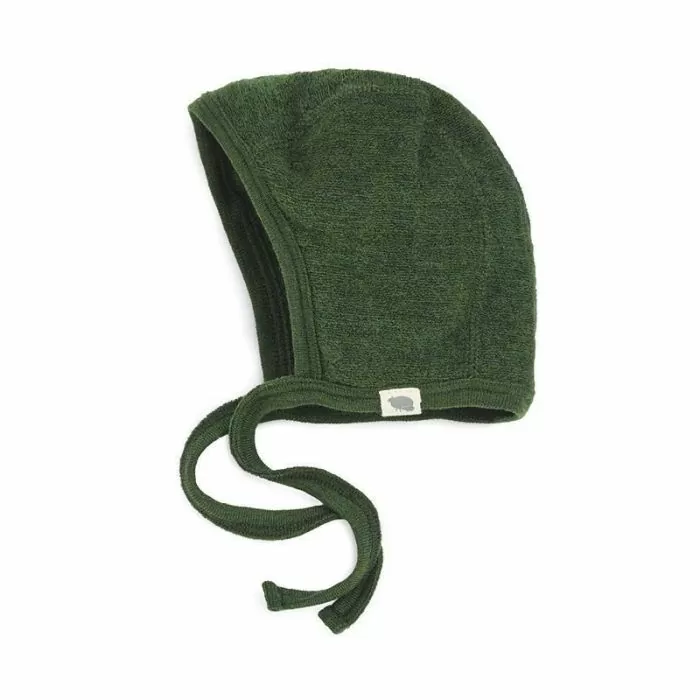 - Myk babylue i hjelm-modell med flate sømmer og knyting under halsen.