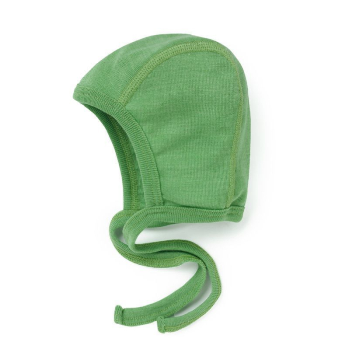 Myk babylue i hjelm-modell med flate sømmer og knyting under halsen. Spedbarn taper mye varme gjennom hodet, og ull regulerer temperaturen bedre enn andre materialer.