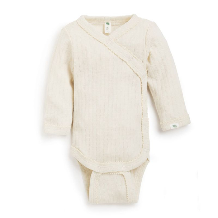 - Det elastiske og myke stoffet i ull med silke gjør bodyen god å vokse i og omslagsåpningen gjør det lett å kle på de aller minste uten å måtte tre den over hodet.