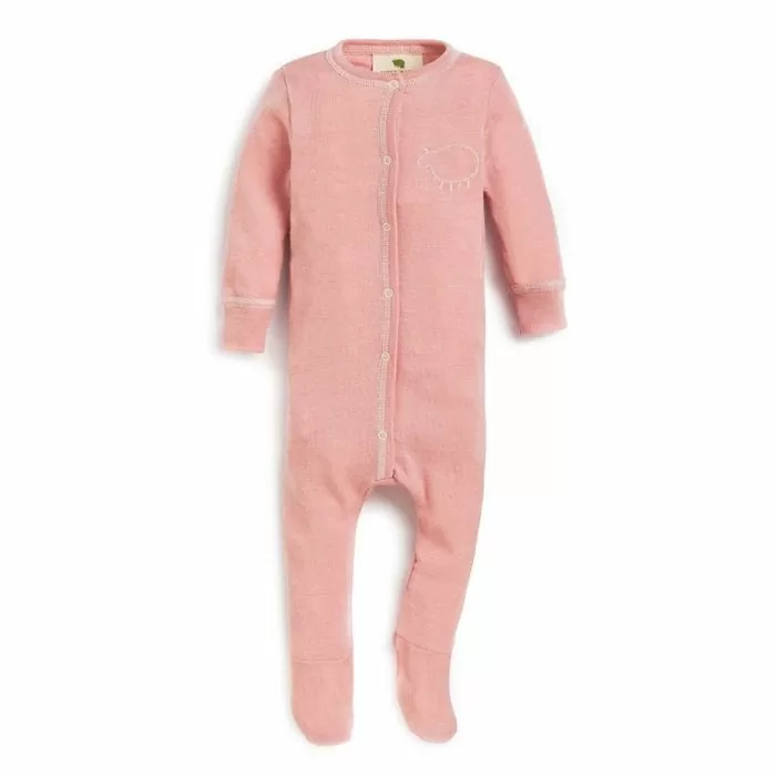 Lett og myk pysj i tynn ull med silke. Pysjen er med fot, og den har trykknapper og et brodert lam på brystet. Spesielt god også på varme netter, fordi ull transporterer fuktighet bort fra huden, og virker temperaturregulerende. Luner godt når det er kaldt. Ull med silke er ekstra mykt og tåles av mange barn som ikke tåler ren ull så godt.