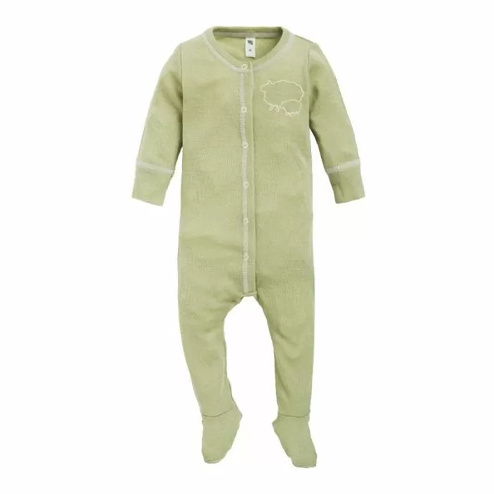Lett og myk pysj i tynn ull med silke. Pysjen er med fot, og den har trykknapper og et brodert lam på brystet. Spesielt god også på varme netter, fordi ull transporterer fuktighet bort fra huden, og virker temperaturregulerende. Luner godt når det er kaldt. Ull med silke er ekstra mykt og tåles av mange barn som ikke tåler ren ull så godt.