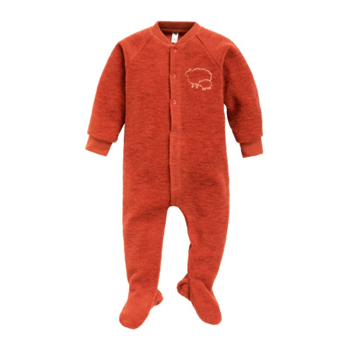 - Ullpyjamasen har trykknapper foran og brodert sau på brystet.
