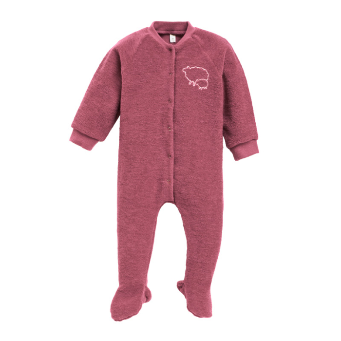 - Ullpyjamasen har trykknapper foran og brodert sau på brystet.