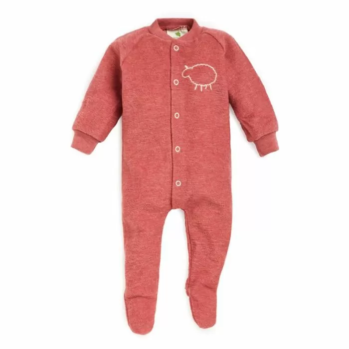 - Ullpyjamasen har trykknapper foran og brodert sau på brystet.