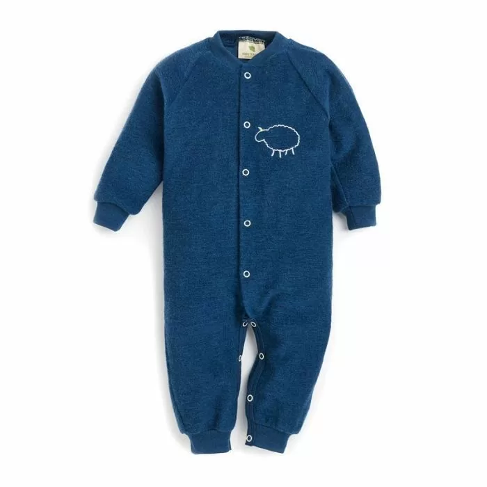 - Ullpyjamasen har trykknapper foran og brodert sau på brystet.