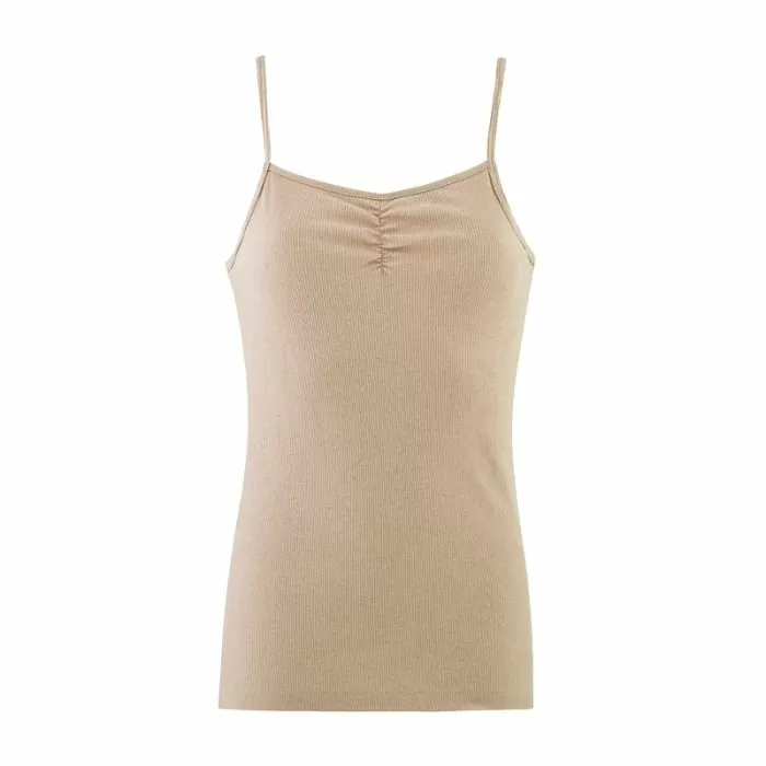 - Myk singlet med tynne stropper. En liten rynkesøm øverst på brystet gir en pen, avrundet v-utrigning. De tynne stroppene gjør denne singleten i ull med silke til et opplagt valg når den ikke skal synes så mye.