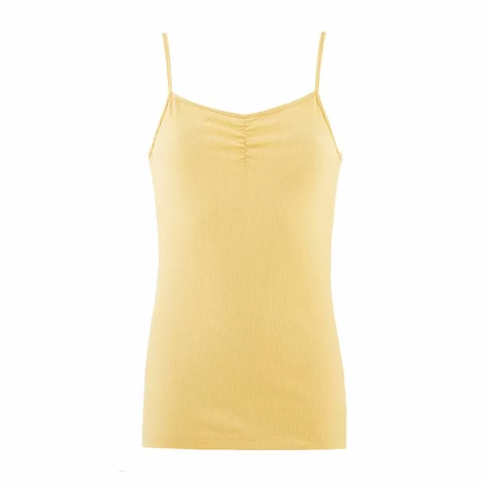 - Myk singlet med tynne stropper. En liten rynkesøm øverst på brystet gir en pen, avrundet v-utrigning. De tynne stroppene gjør denne singleten i ull med silke til et opplagt valg når den ikke skal synes så mye.