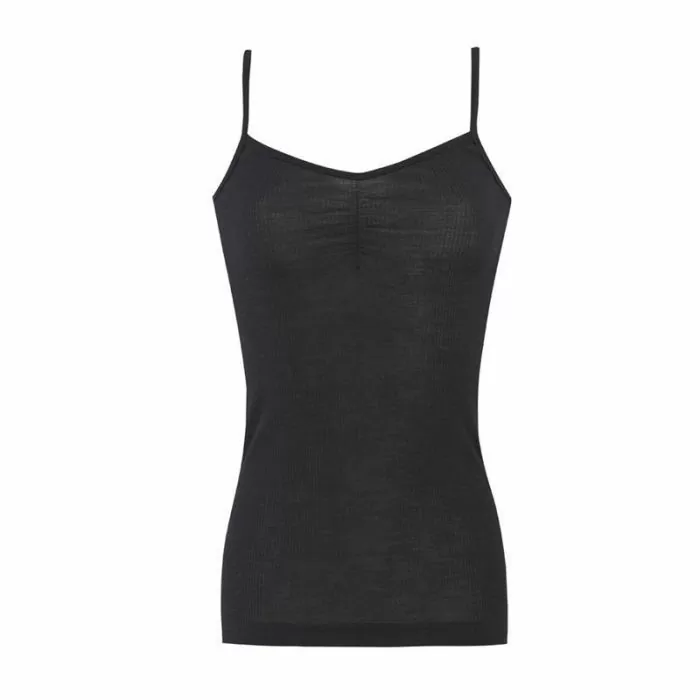 - Myk singlet med tynne stropper. En liten rynkesøm øverst på brystet gir en pen, avrundet v-utrigning. De tynne stroppene gjør denne singleten i ull med silke til et opplagt valg når den ikke skal synes så mye.
