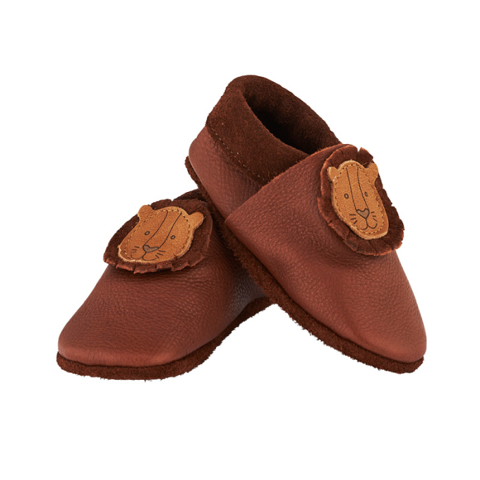 Tøfler uten fôr, laget av mykt økologisk skinn. Skinntøflene er myke og sitter godt på små føtter.
