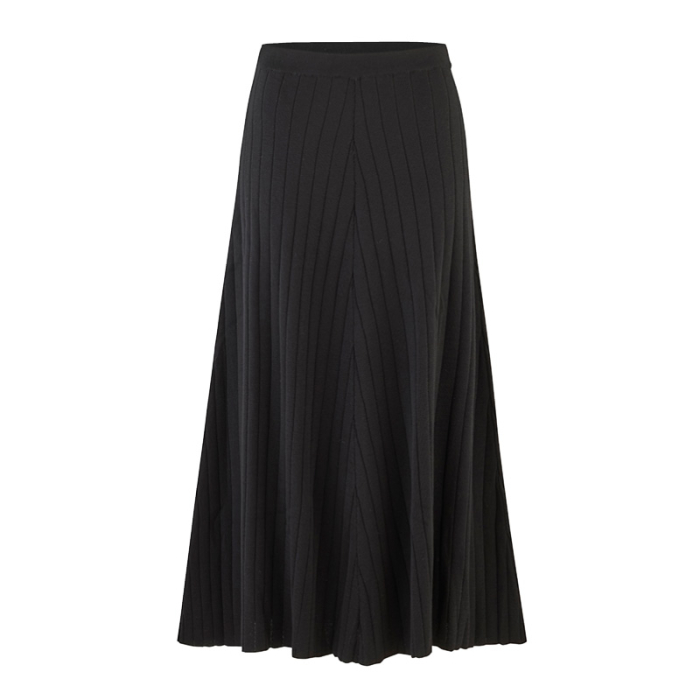 Et ankellangt ullskjørt med utsvinger silhuett. Skjørtet har elastikk i midjen og dekorative vertikale striper i strikket struktur. Skjørtet er strikket i mellomtykk og myk merinoull.