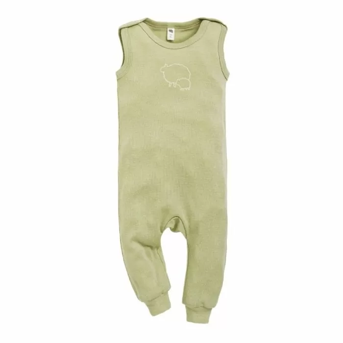 En skikkelig deilig sparkebukse til de små i myk ull-silkeblanding. Super om sommeren også. Det myke elastiske stoffet og bråtene/kantene på føttene, gjør at den er god å vokse i. Ingenting som strammer rundt magen. Rask og lett å ta av og på ved bleieskift siden den kun knappes på skuldrene. Den sitter høyt og godt i livet, slik at man kan velge trøye inni i stedet for body, hvis man ønsker det.