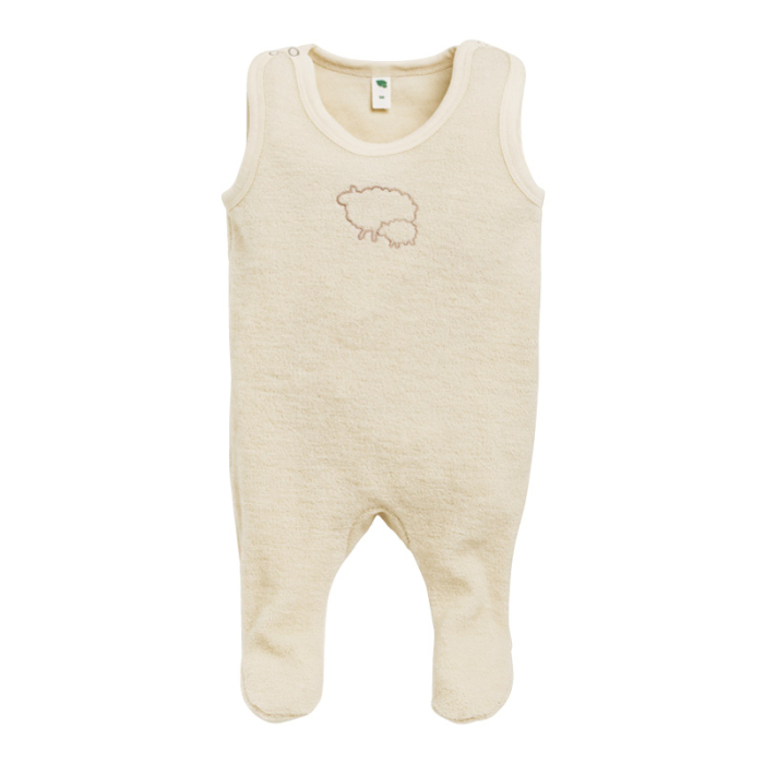 Buksen har trykknapper på skuldrene og brodert sau på brystet. Våre sparkebukser er myke og elastiske og gir god plass til bleiestumpen. Ingen ting strammer rundt magen. Barn er ikke små voksne, de skal ha klær til å bevege seg i.