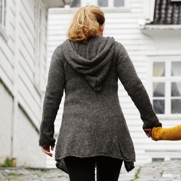 Strikkeoppskrift på en glattstrikket, smal hettejakke i en tråd Merinoull eller Silkeull til dame. Jakken har A-fasong, rundfelt bærestykke, spiss hette og rullekanter.
