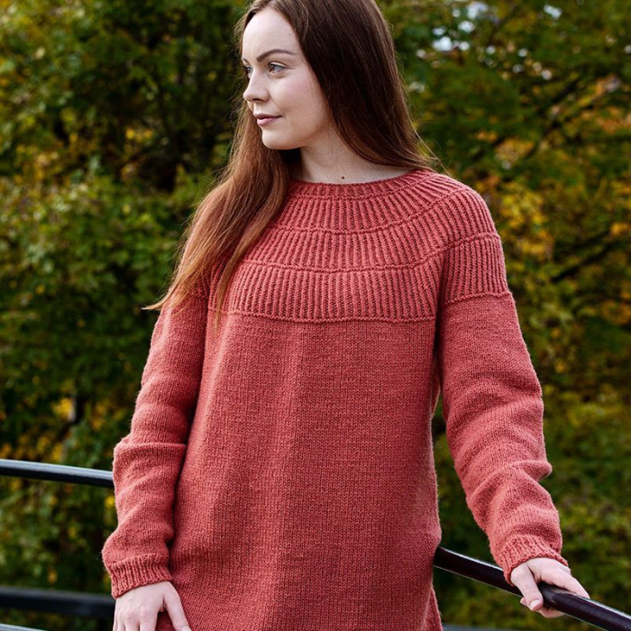 Strikkeoppskrift på en lang og deilig strikkegenser med fint rillemønster på bærestykket. Fellingene gjøres mellom de brede rilleradene, slik at det dannes tre fine rillekranser før halsfellingen. Frøyagenser strikkes nedenfra og opp i glattstrikk med rundfelling. Strikkes rundt på rundpinne med glattstrikk og vrangbord. Genseren er lengre bak enn fremme.