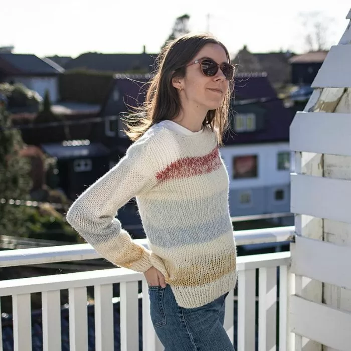 Teknikker: Glattstrikk med striper/graderinger; bytting av tråd, Skuldersøm (usynlig søm), Plukke opp masker, Nedenfra og opp Modell 1: (Merinoull) Farge A: 810 Natur, Farge B: 882 Havre, Farge C: 8501 Isblå, Farge D: 8360 Rustrosa