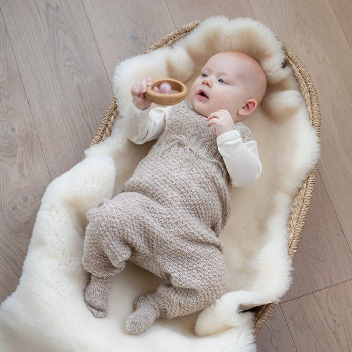 Strikkeoppskrift på en god og klassisk sparkebukse i dobbel perlestrikk og med snøring i livet. Velg om du vil strikke den med eller uten føtter. Buksen strikkes ovenfra og ned i dobbel perlestrikk. Man begynner frem og tilbake med selene og forstykket, deretter bakstykket. Buksen strikkes så rundt ned til skrittet, og bena strikkes rundt hver for seg.