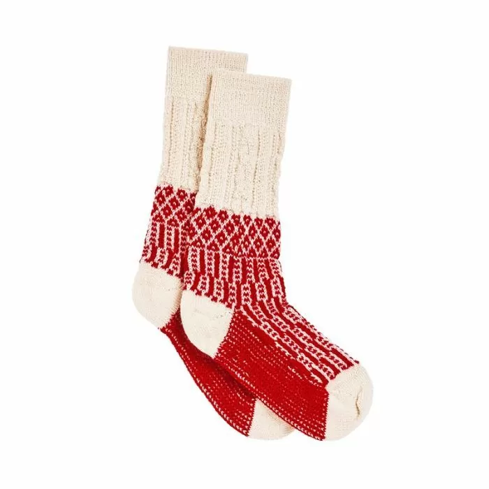 Mellomtykke ullsokker med mønster. Flettemønster øverst. Naturhvit og rød