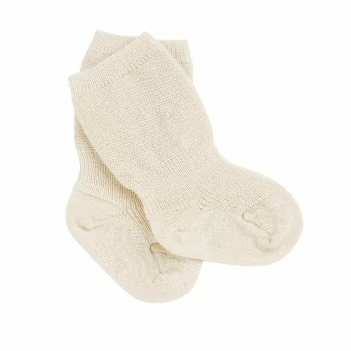 Lune ullsokker i tynnribbet struktur. Fasongen gjør at de sitter godt på. Ull innerst er godt for små føtter, så behold dem gjerne på også hvis barnet har andre sokker eller sparkebukse med fot utenpå. Svetter barnet mye på føttene vil de tove noe.