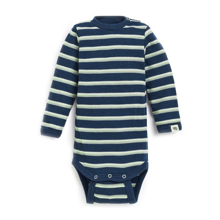 Ullbody i økologisk, ubehandlet ull. Lange ermer og god halsåpning med perlemorsknapper på skulderen, slik at den lett går over hodet, og samtidig sitter inntil. Ullbodyen er elastisk og myk å ha på, og den vokser med barnet.
