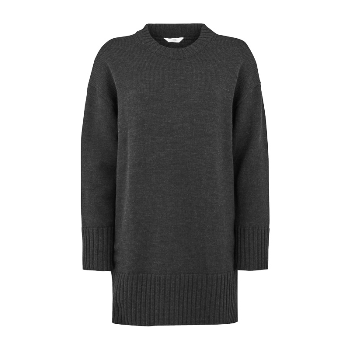 Tykk strikket ullkjole/lang genser. Genseren er en lang og vid modell. Den har lave skuldre og vidde i ermene. Høy ribbekant nederst på bol og ermer. Behagelig og romslig.